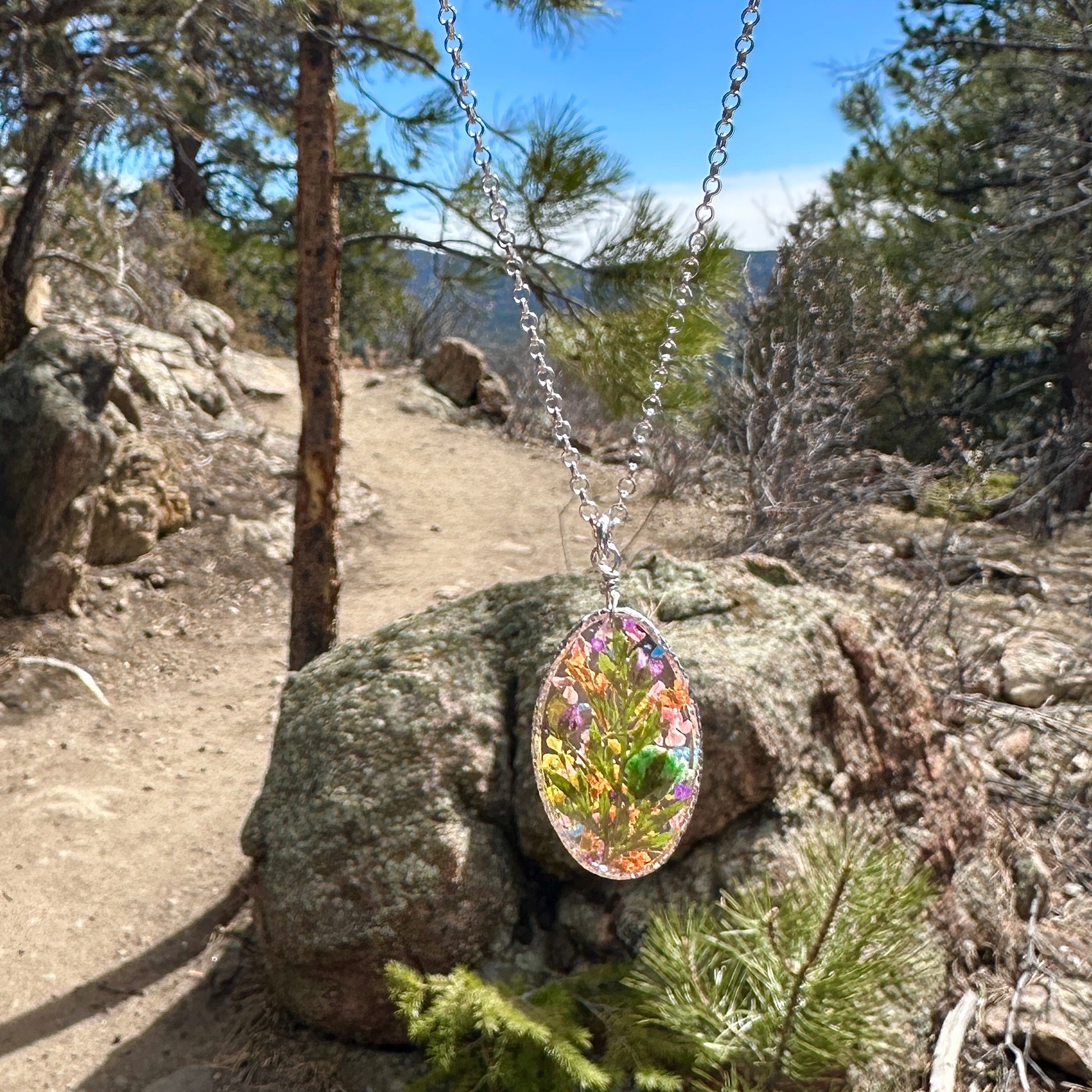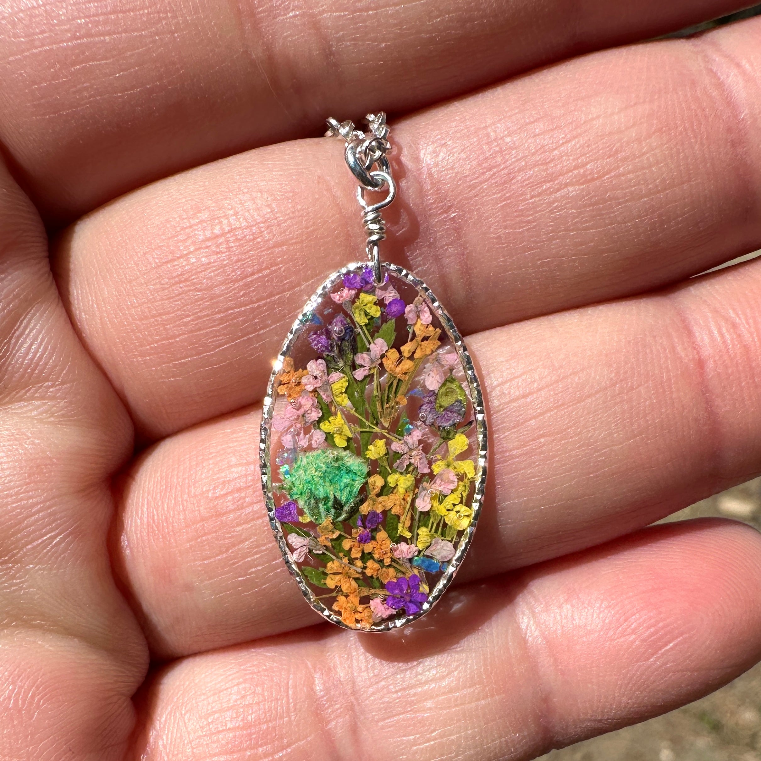🌸Beautiful botanical garden necklace designed with a cheerful bouquet of pastel wildflowers and natural ferns. The flowers are pressed, dried and preserved in resin.