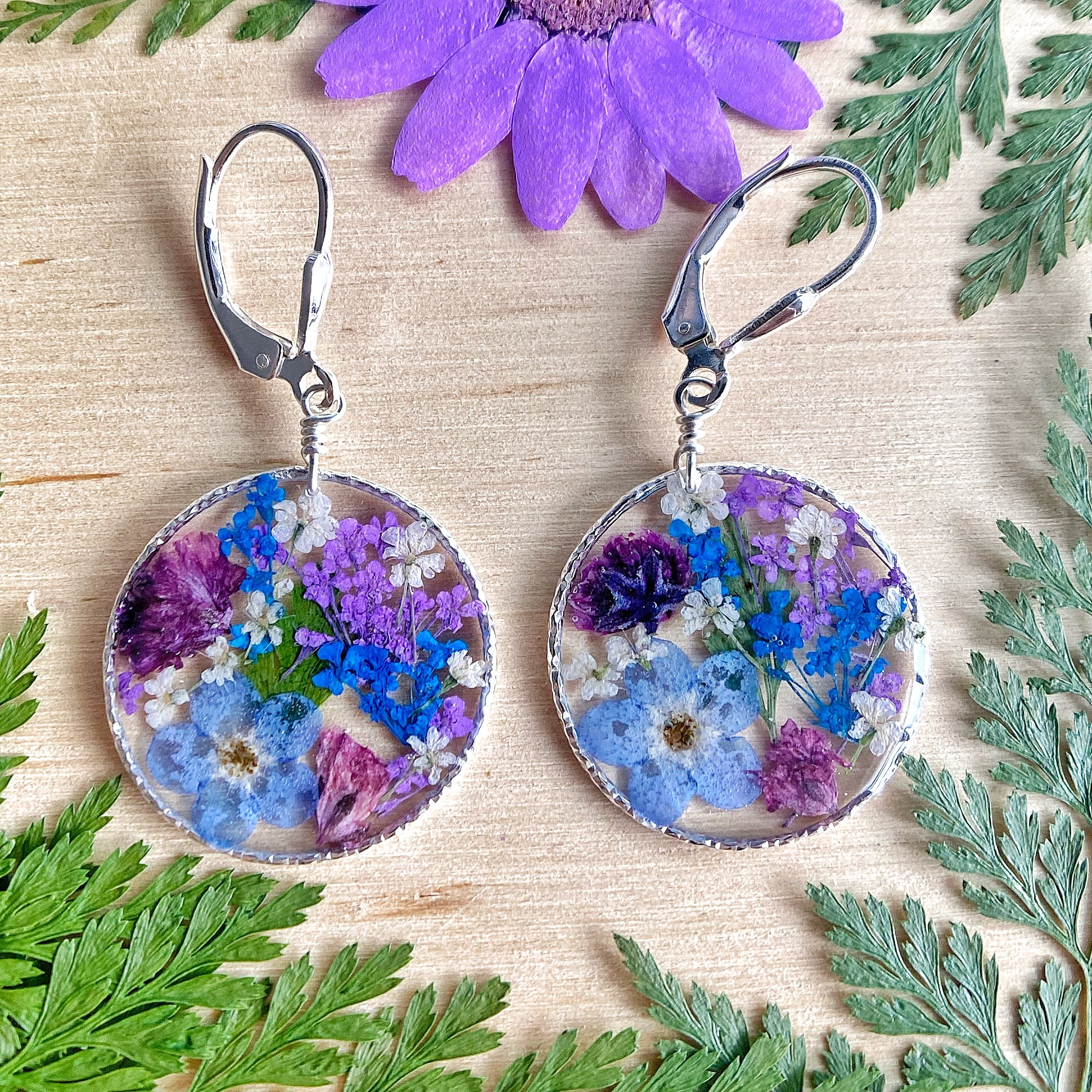 🌿 Beautiful botanical garden earrings featuring calming periwinkle forget me not flowers + purple and ocean blue baby’s breathe and queen anne’s lace flowers preserved in resin and finished in sterling silver.