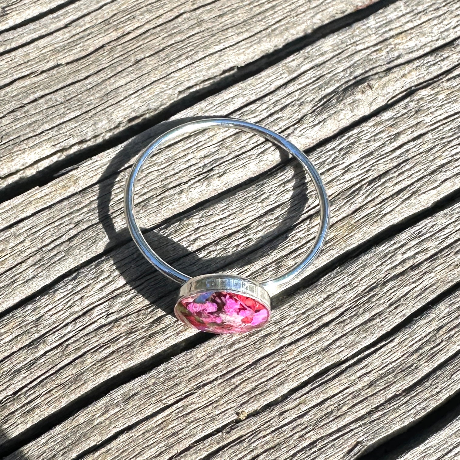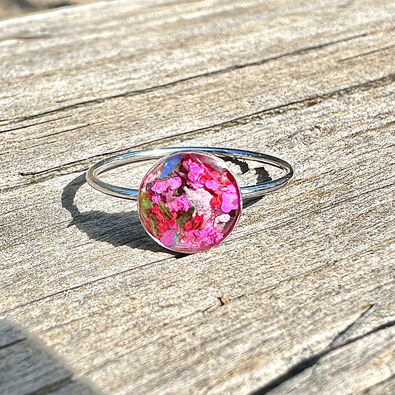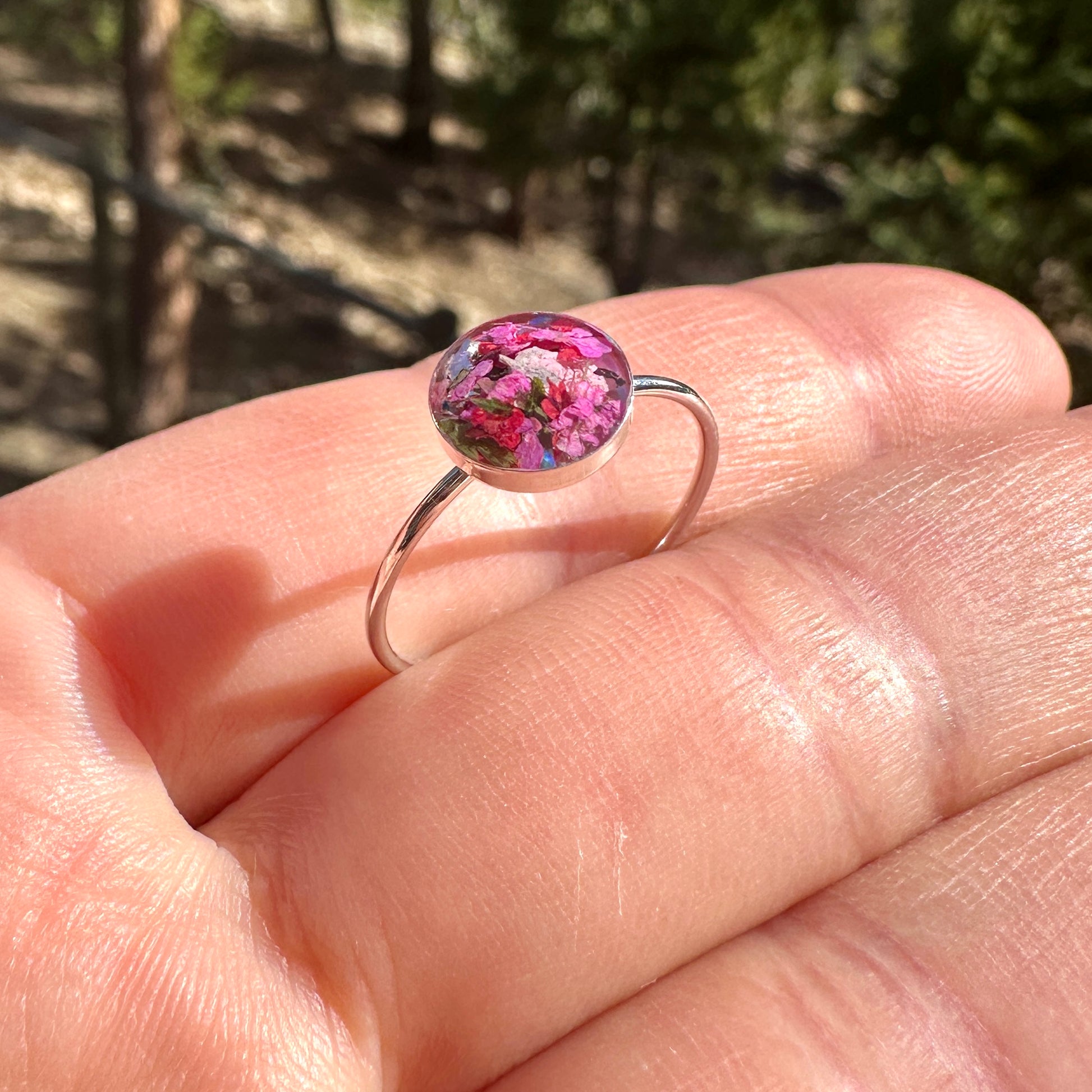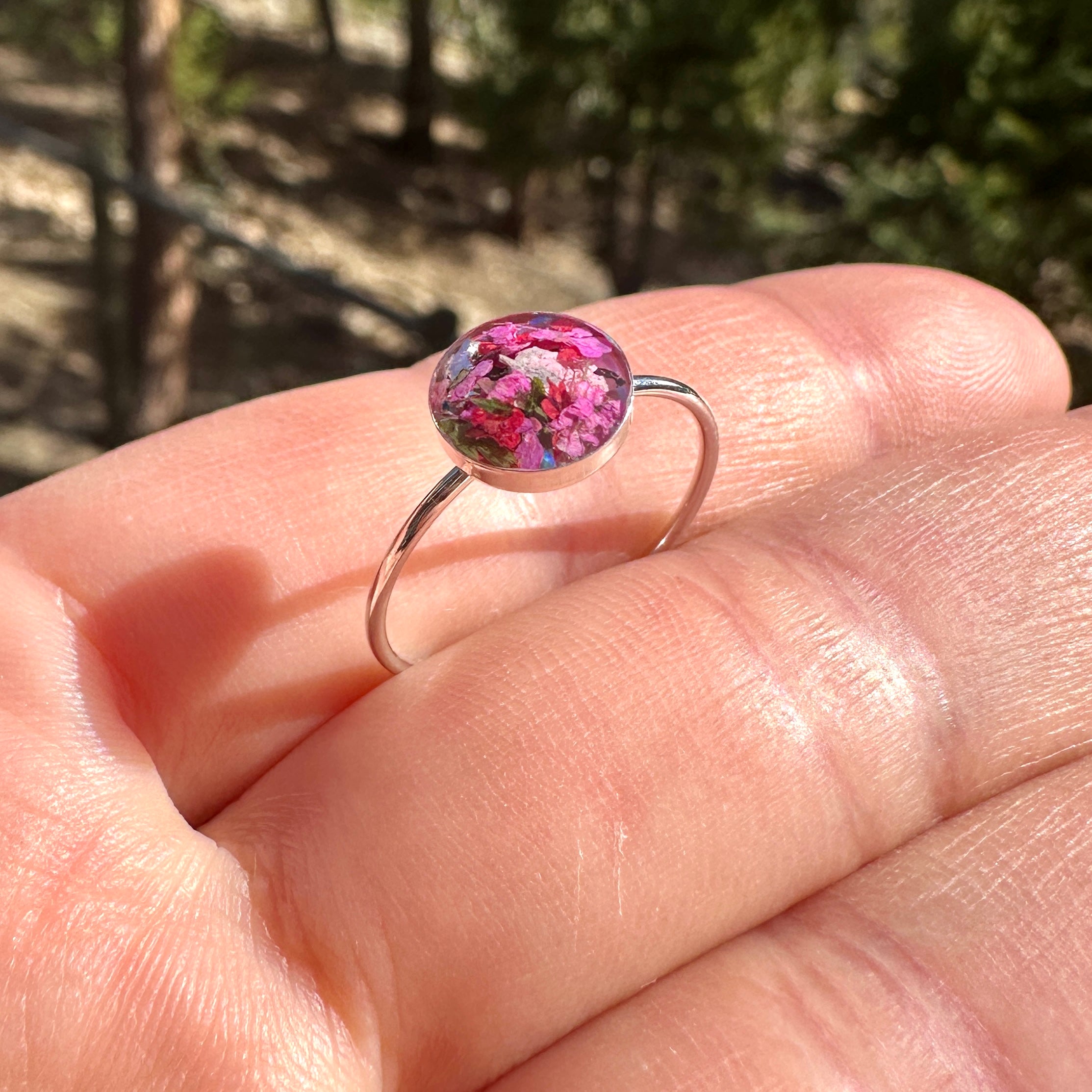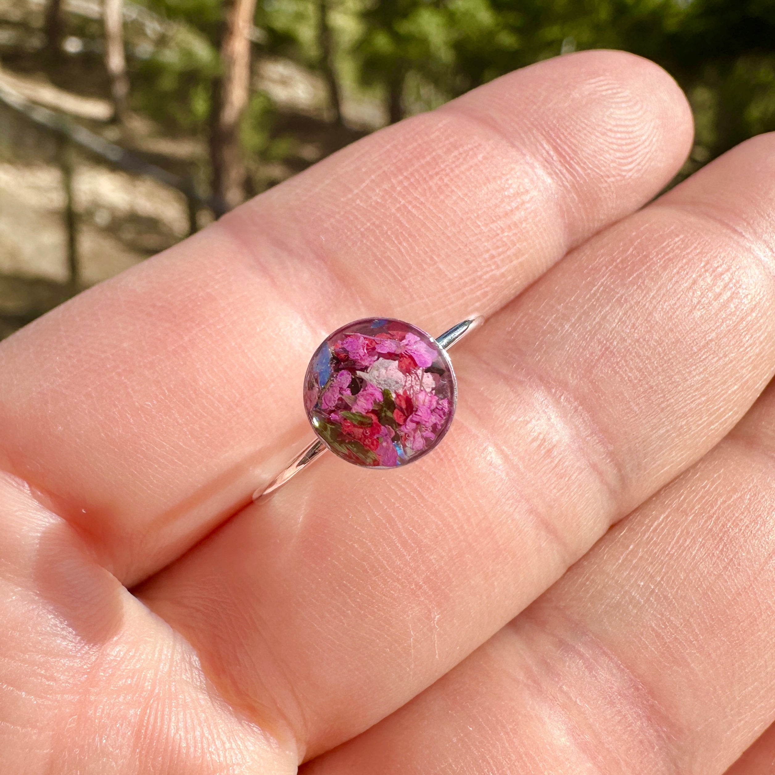 🌸One of a kind, handmade real flowers terrarium ring with a happy bouquet of natural pink tiny flowers, ferns and iridescent opal gemstones. These rings layer perfectly with your everyday rings and add color, nature and happiness to your wardrobe🌼