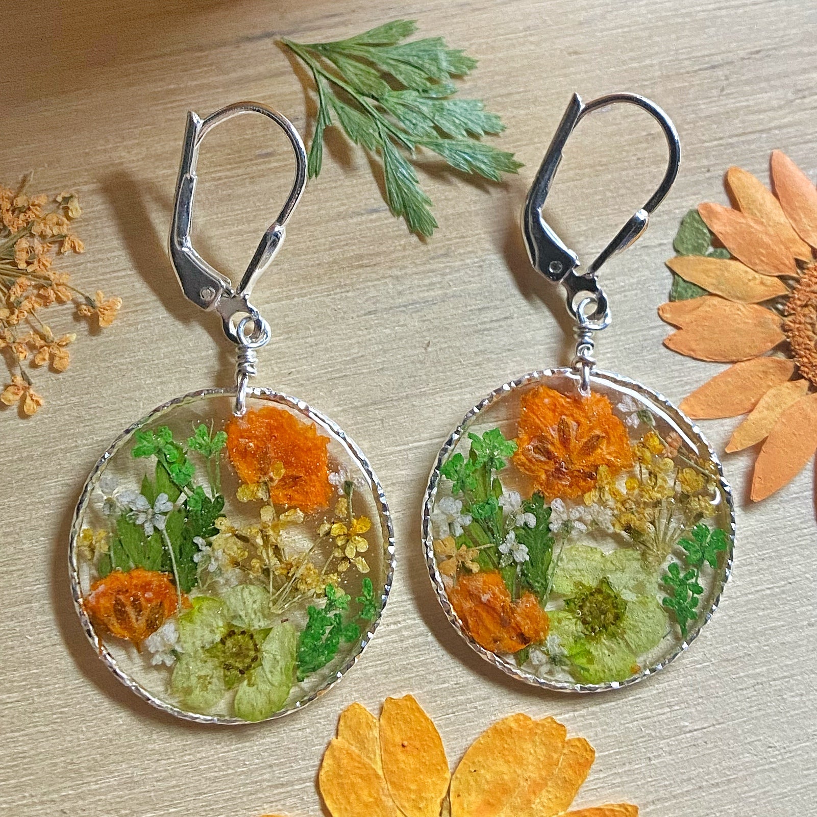 Orange and green themed botanical garden earrings featuring forget me not flowers, baby’s breath flowers, queen anne’s lace flowers and natural ferns.