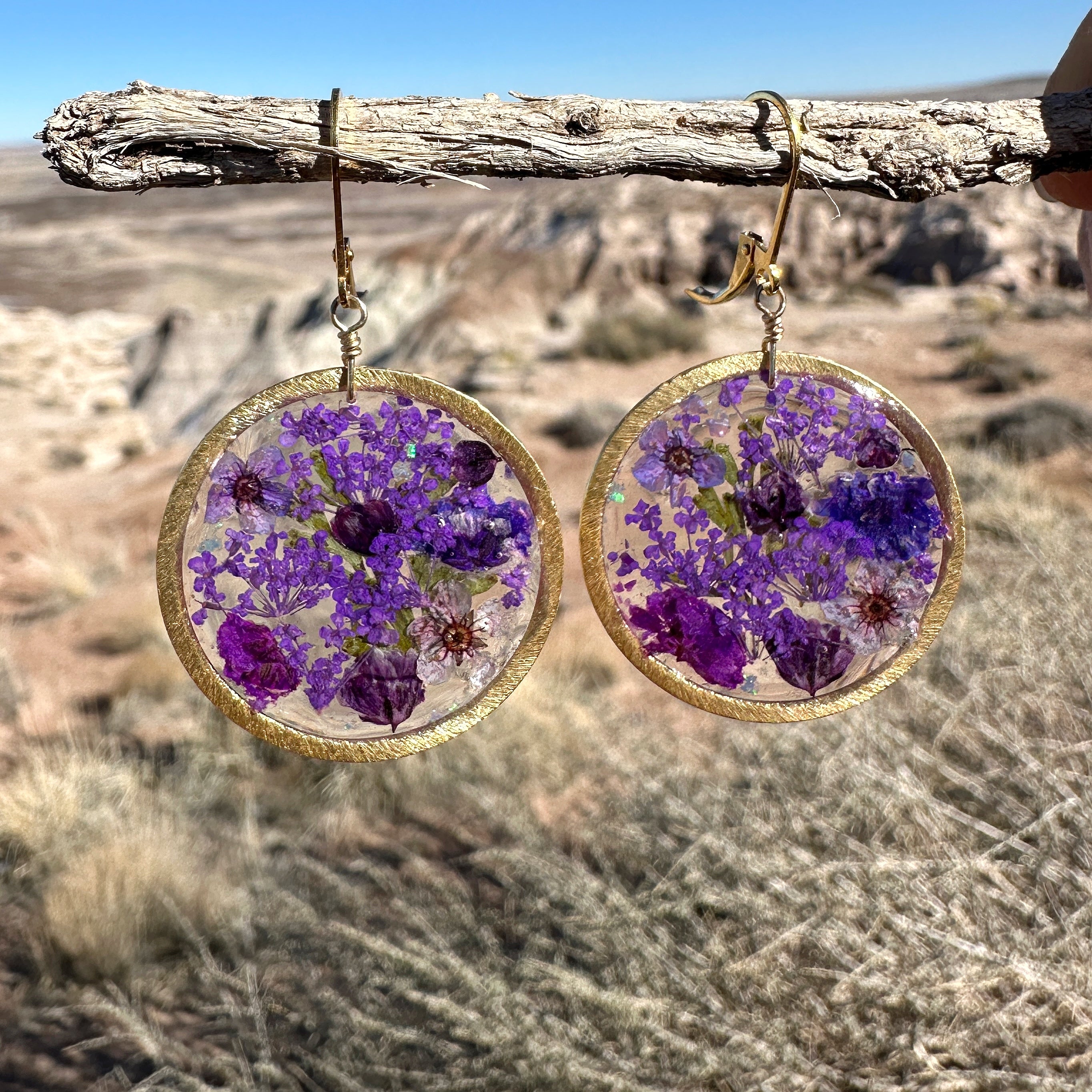 🌿Vibrant purple botanical garden flower earrings with natural baby’s breath, queen anne’s lace, forget me not flowers and ferns. Shimmering blue opal gemstone chips are also incorporated into this beautiful garden. The flowers are pressed, dried and preserved in resin. Â