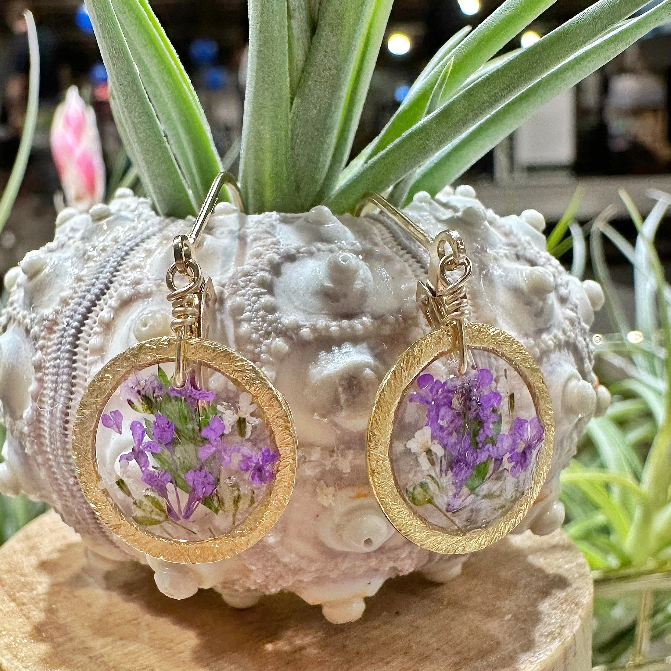 🌿One of a kind, handmade botanical garden earrings designed with purple and white wildflowers and ferns.
