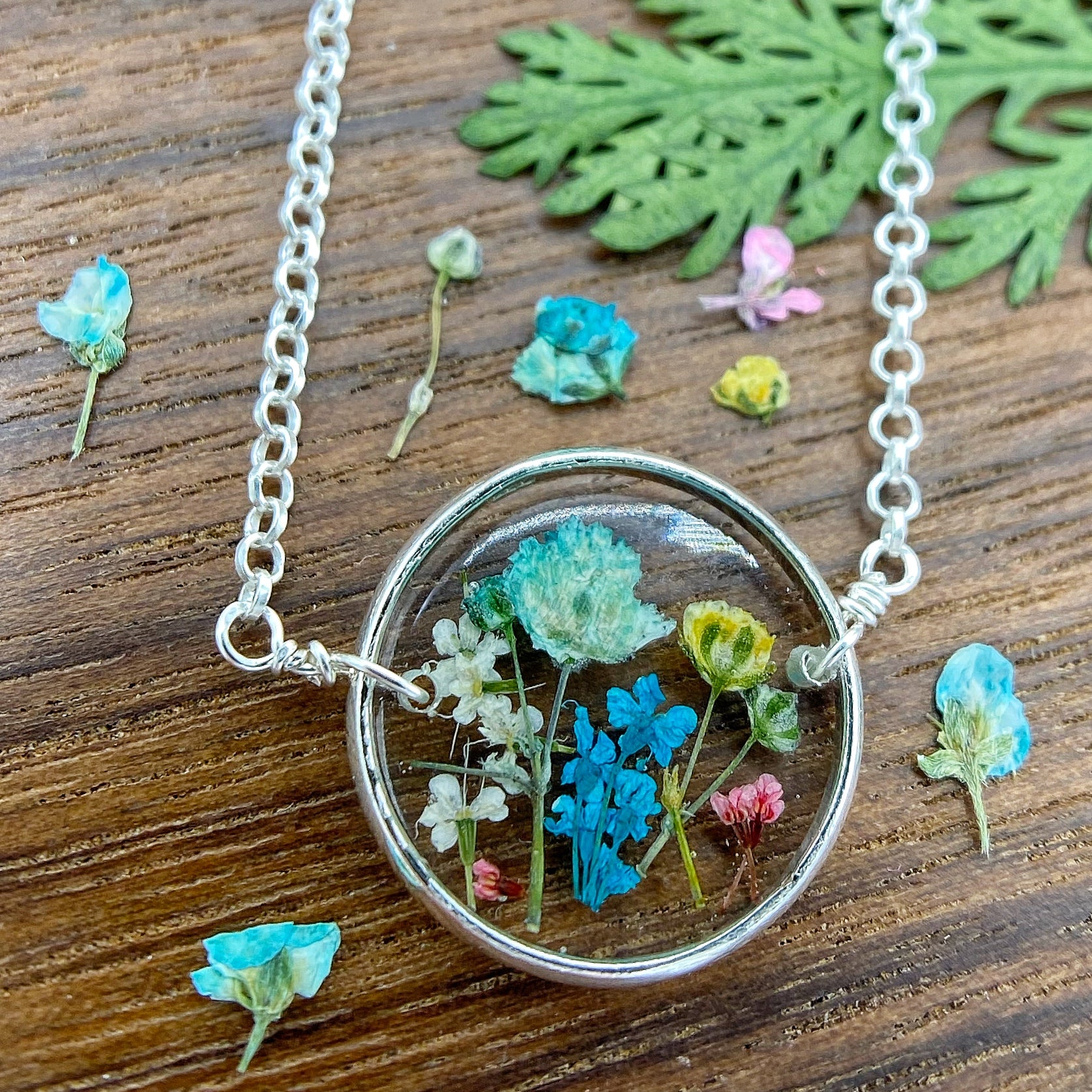 🌻One of a kind handmade necklace designed with a beautiful collage of natural wildflowers encased in clear resin and finished with sterling silver details. 🌸