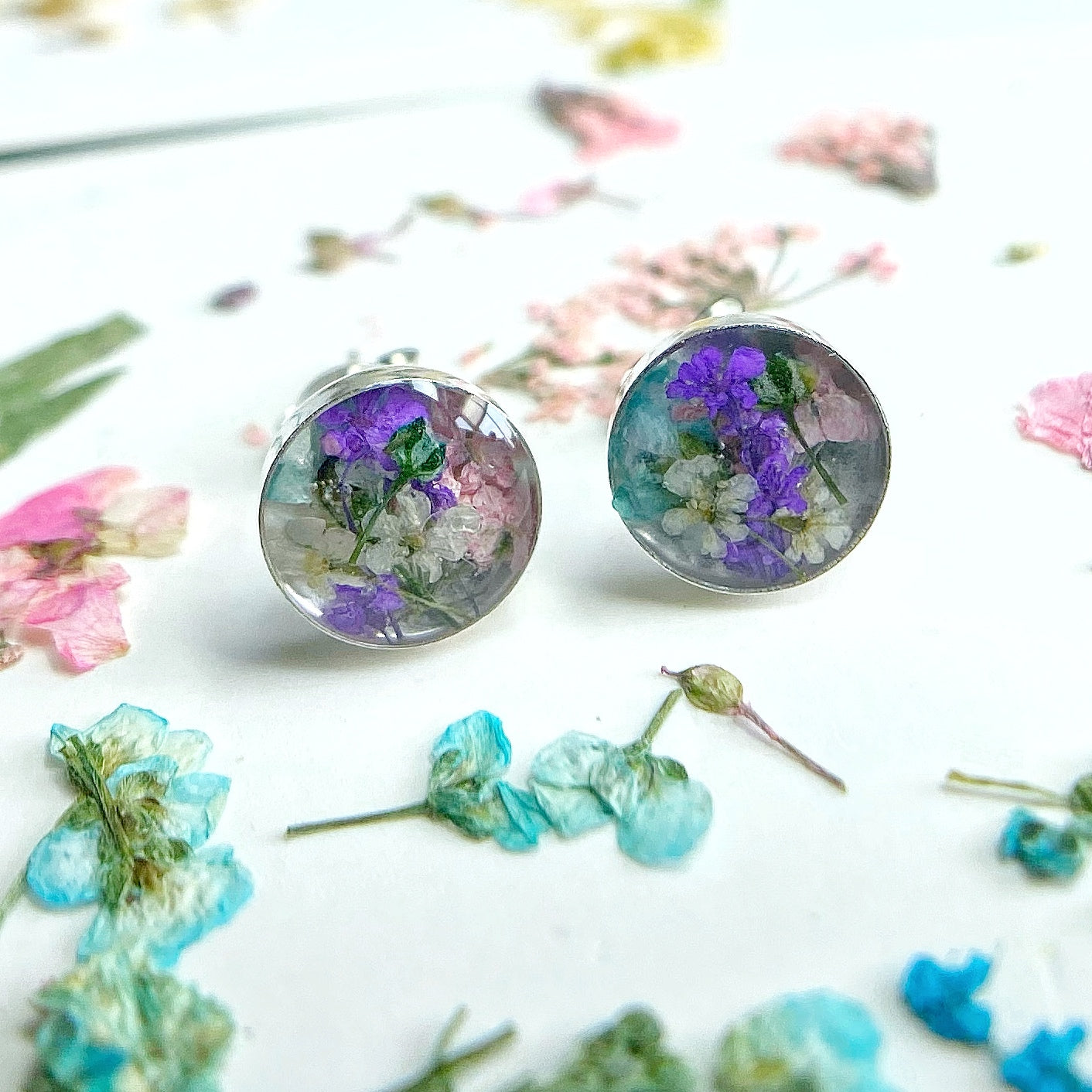 🌻One of a kind handmade stud earrings designed with a beautiful collage of purple, pinks, aqua and white natural wildflowers encased in clear resin and finished with sterling silver details. 🌸