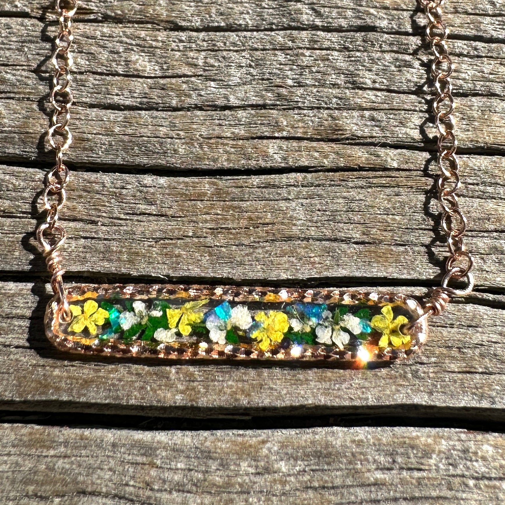 This delicate bar necklace features real hand-pressed yellow and white queen anne’s lace flowers preserved in crystal-clear resin, creating a one-of-a-kind piece you’ll treasure forever. Each tiny bloom is carefully arranged by hand, making every necklace completely unique—just like you.