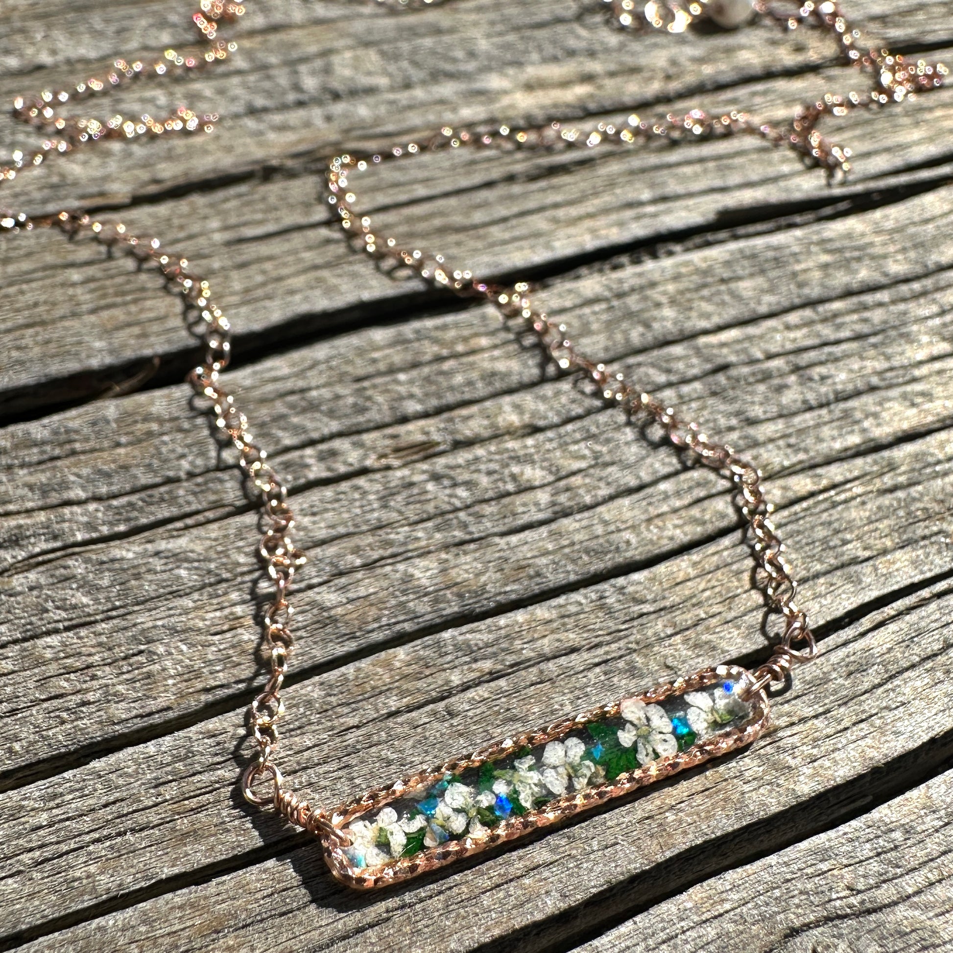 This delicate bar necklace features real hand-pressed white queen anne’s lace flowers preserved in crystal-clear resin, creating a one-of-a-kind piece you’ll treasure forever. Each tiny bloom is carefully arranged by hand, making every necklace completely unique—just like you.