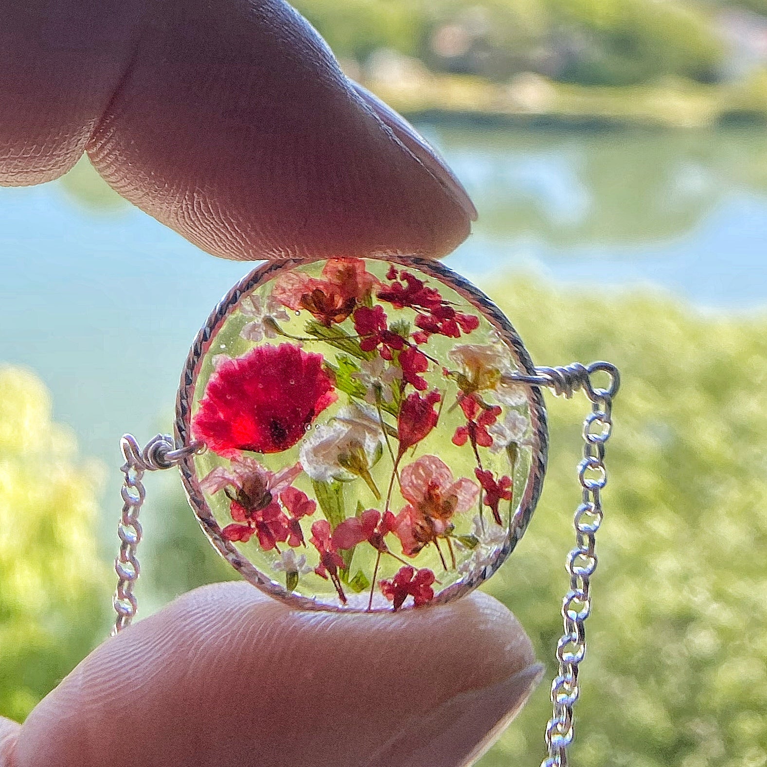 Joyful, ruby red garden necklace designed with red and white natural flowers and green ferns preserved in resin and finished in sterling silver.