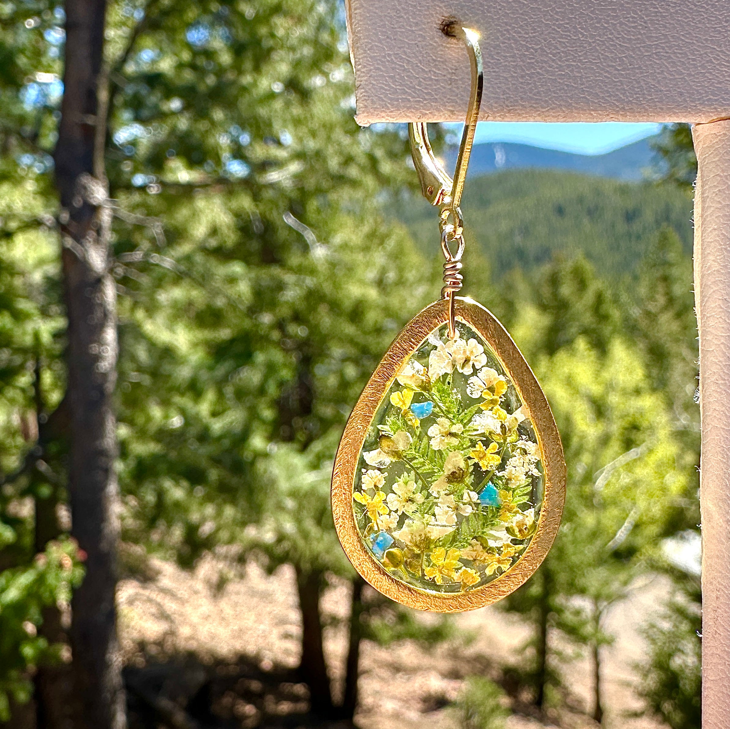 🌿Cheerful botanical flower earrings in a teardrop shape frame created with yellow and white pressed flowers and natural ferns preserved in resin.