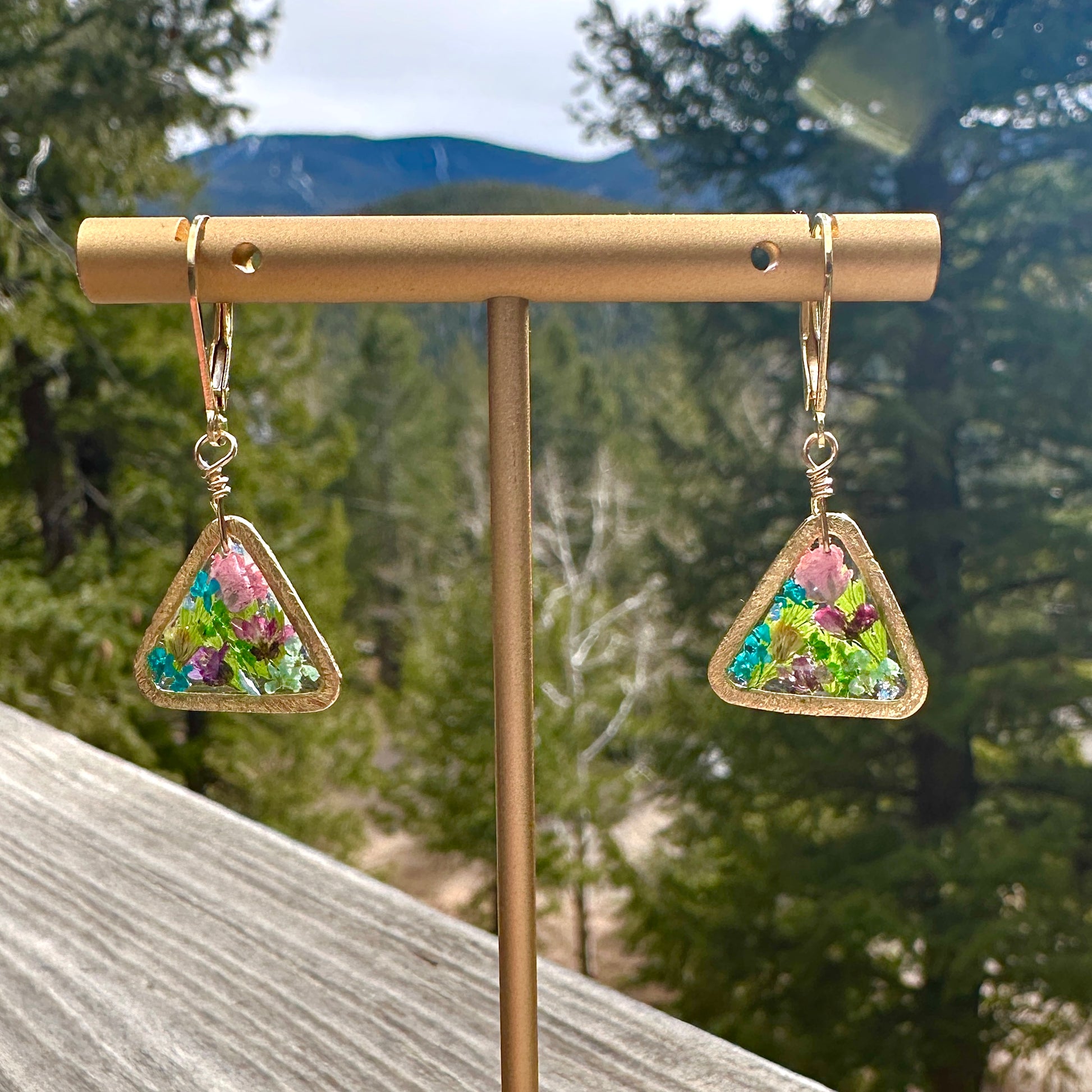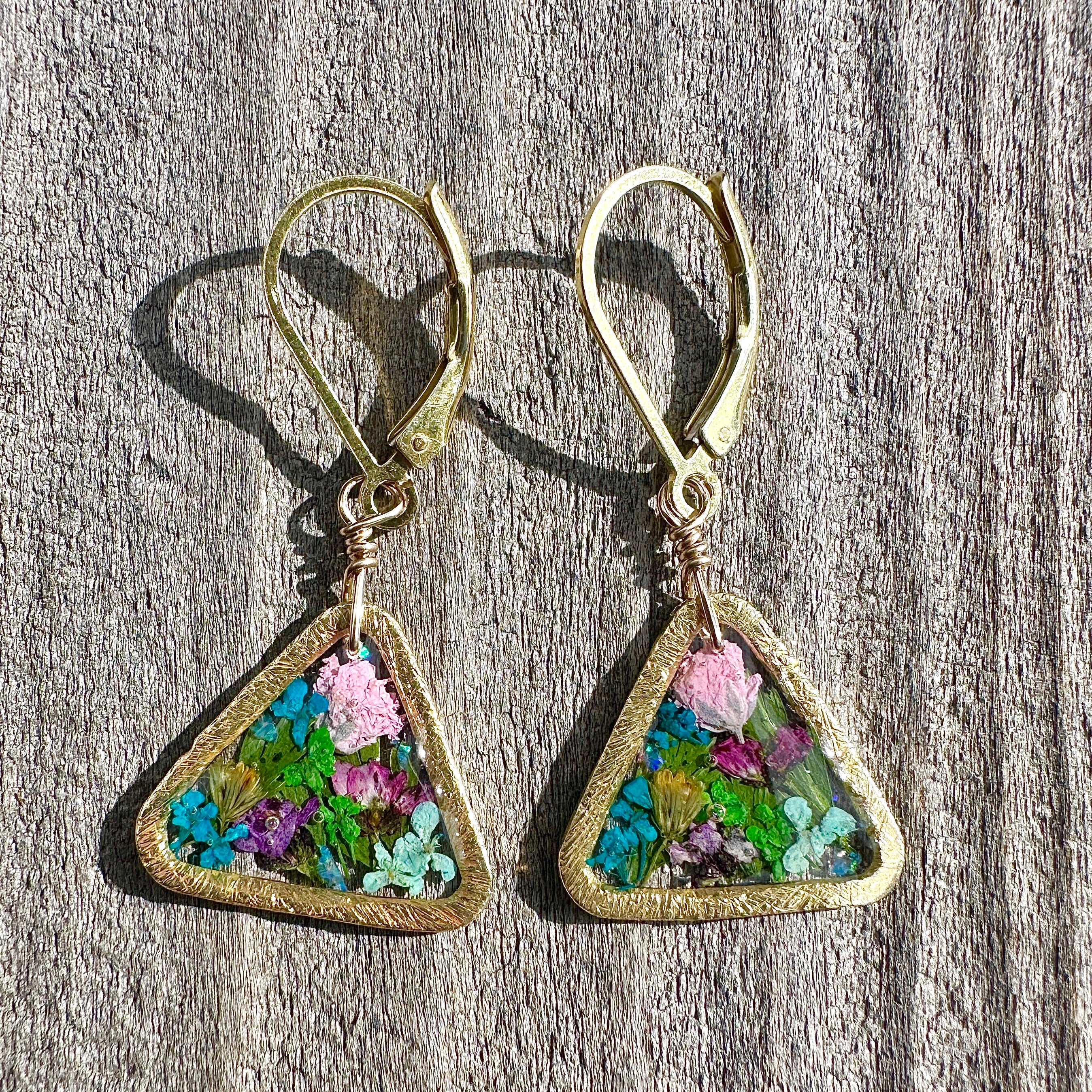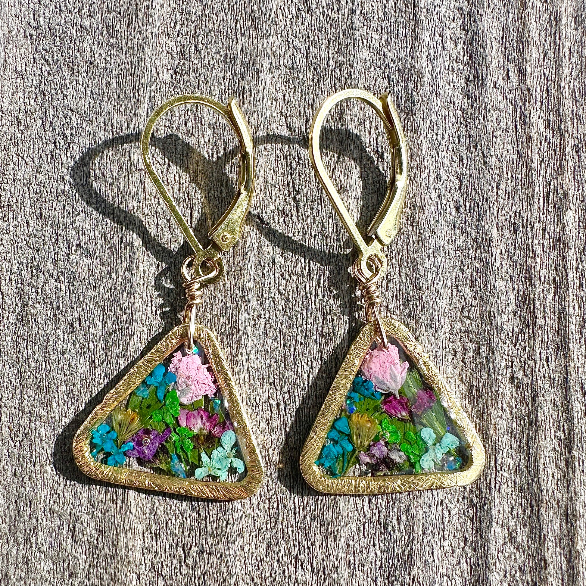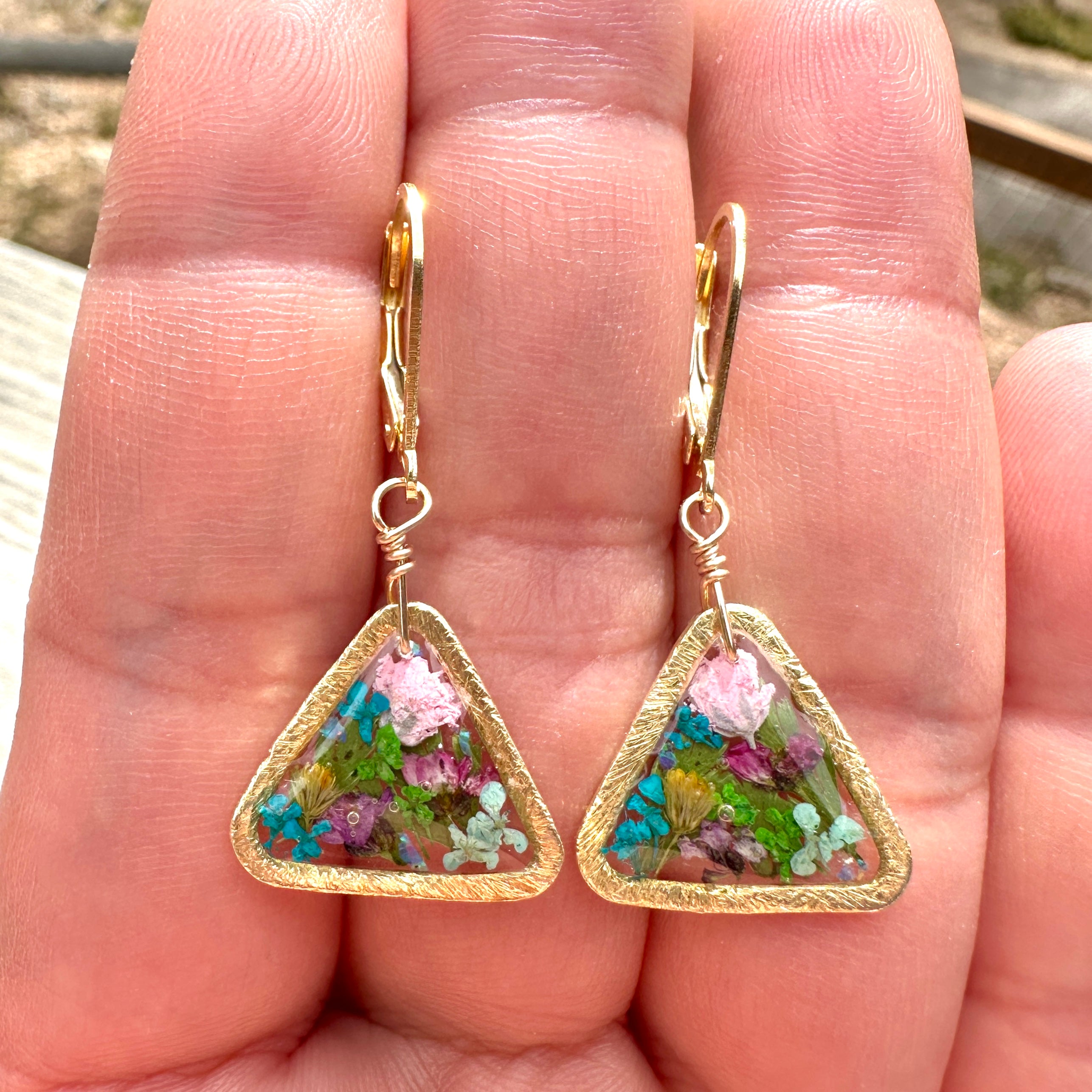 🌿Colorful botanical flower earrings in a triangular frame created with pressed flowers and natural ferns preserved in resin.