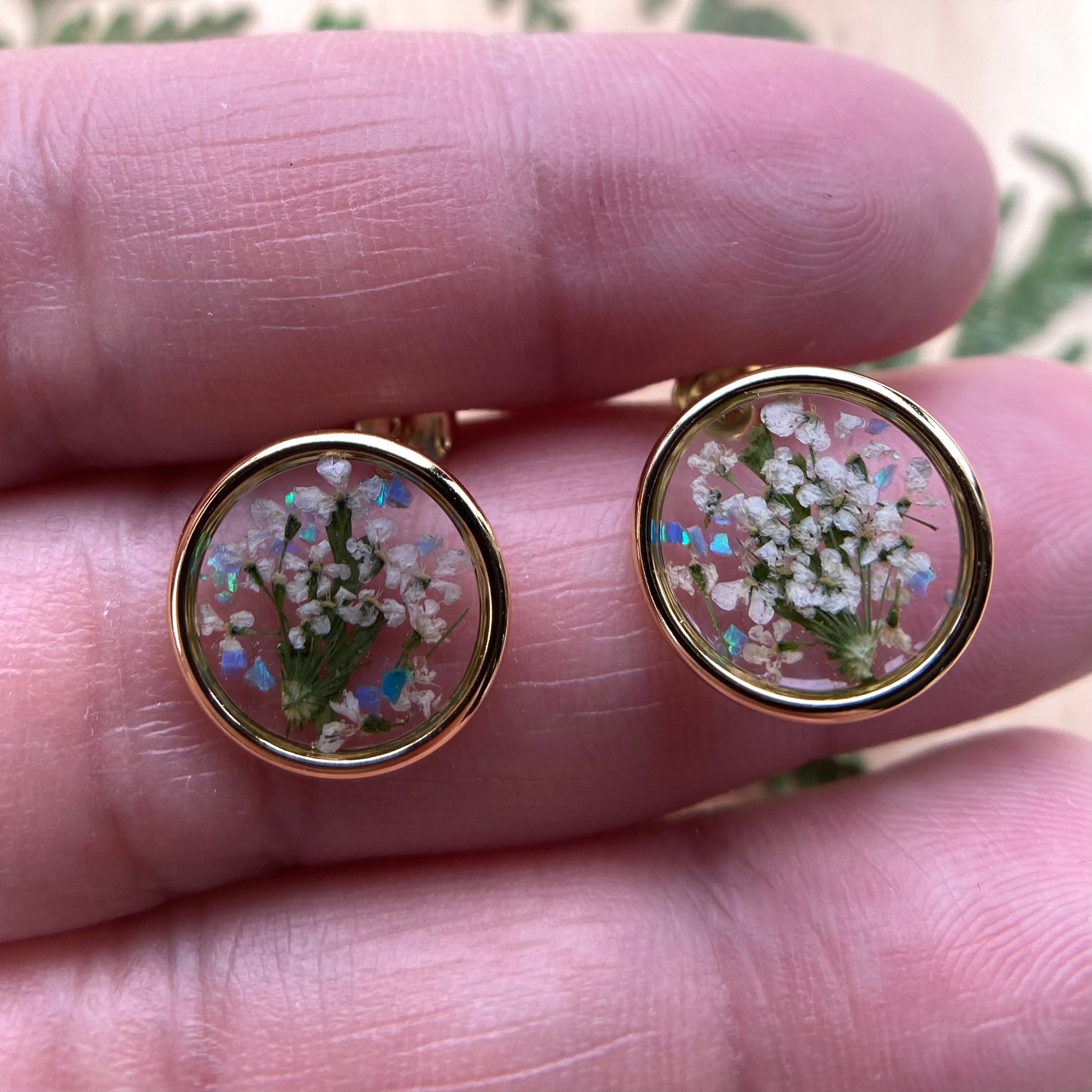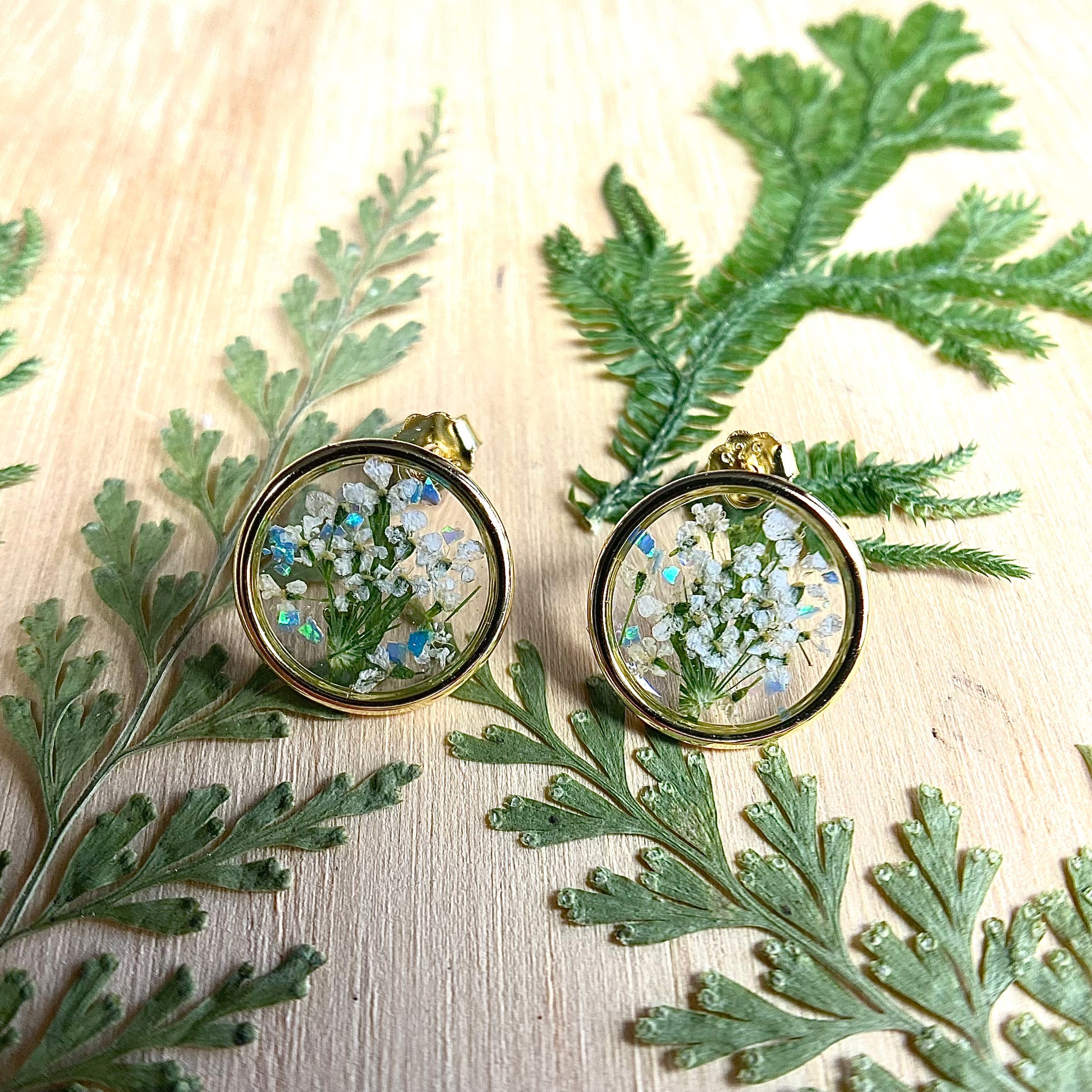 🌿 Elegant botanical stud earrings designed with white queen anne’s lace flowers, natural ferns and iridescent blue opal gemstones preserved in resin.