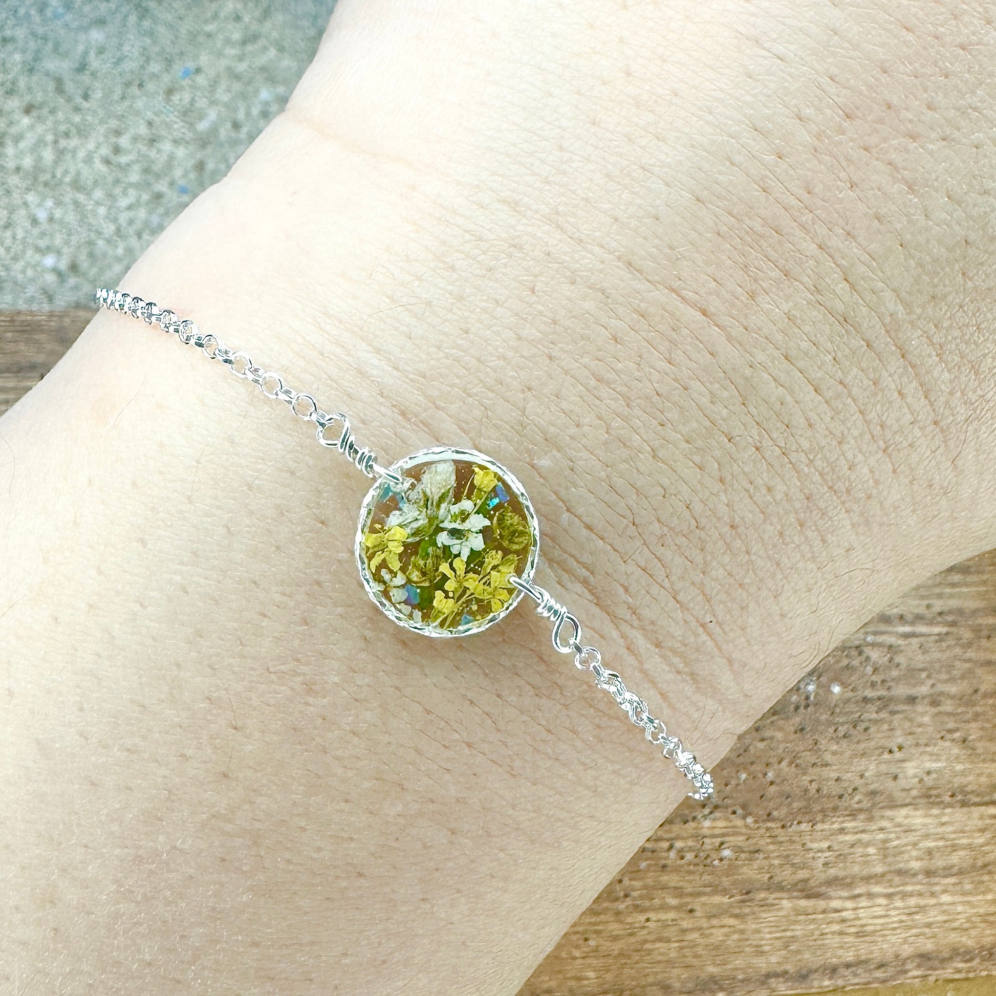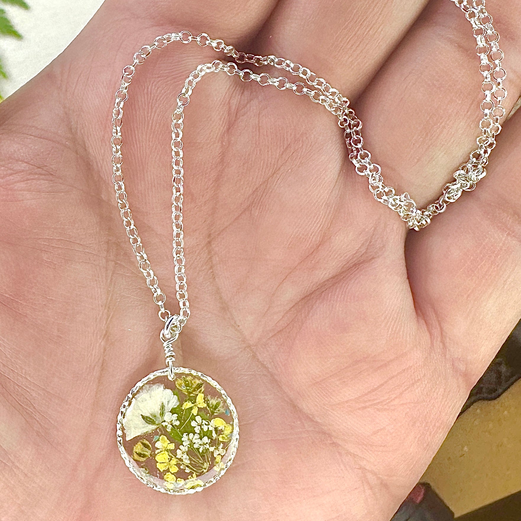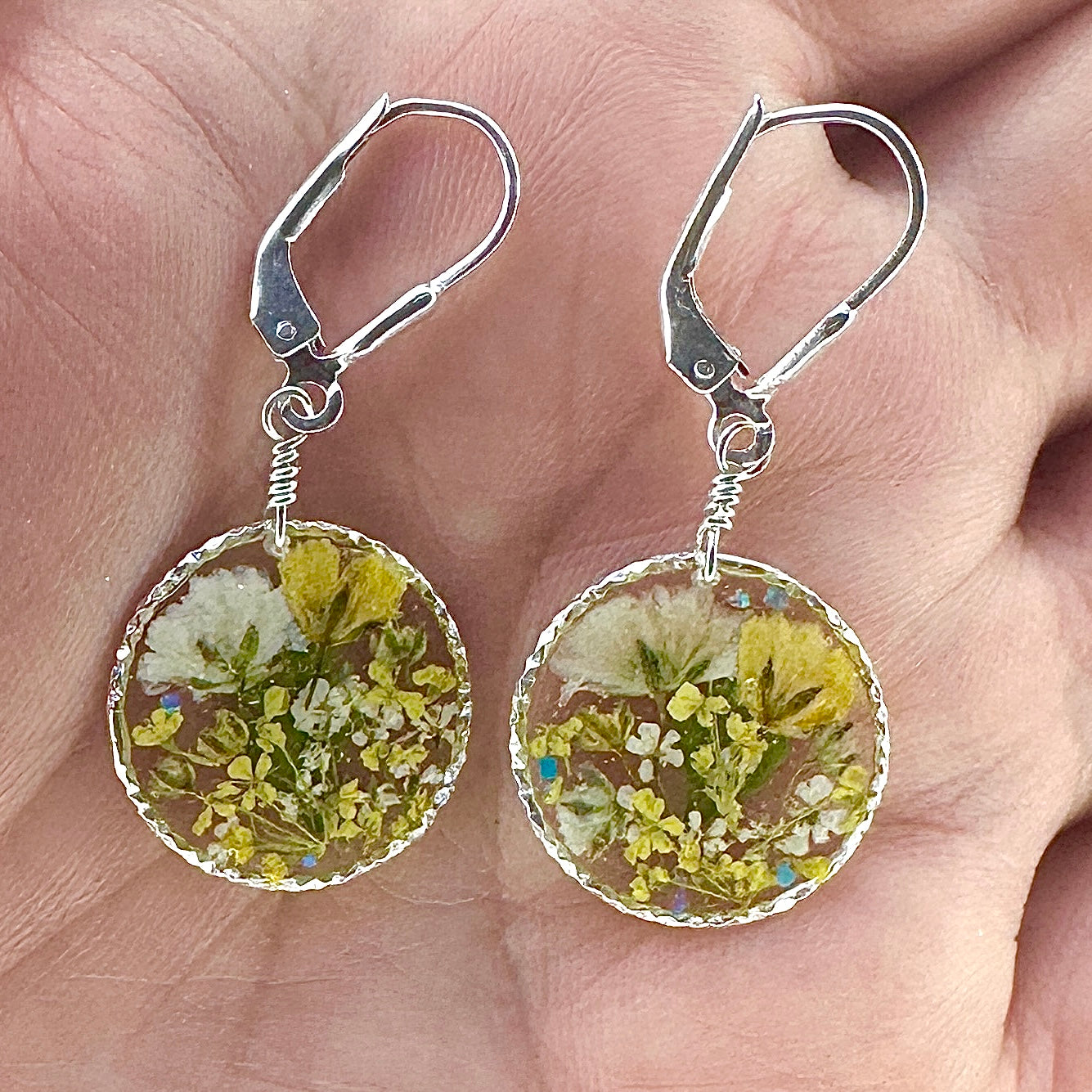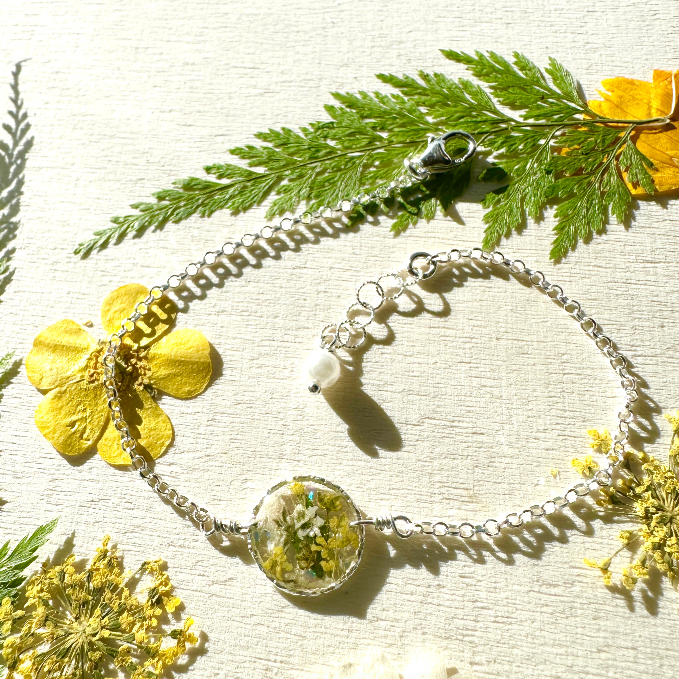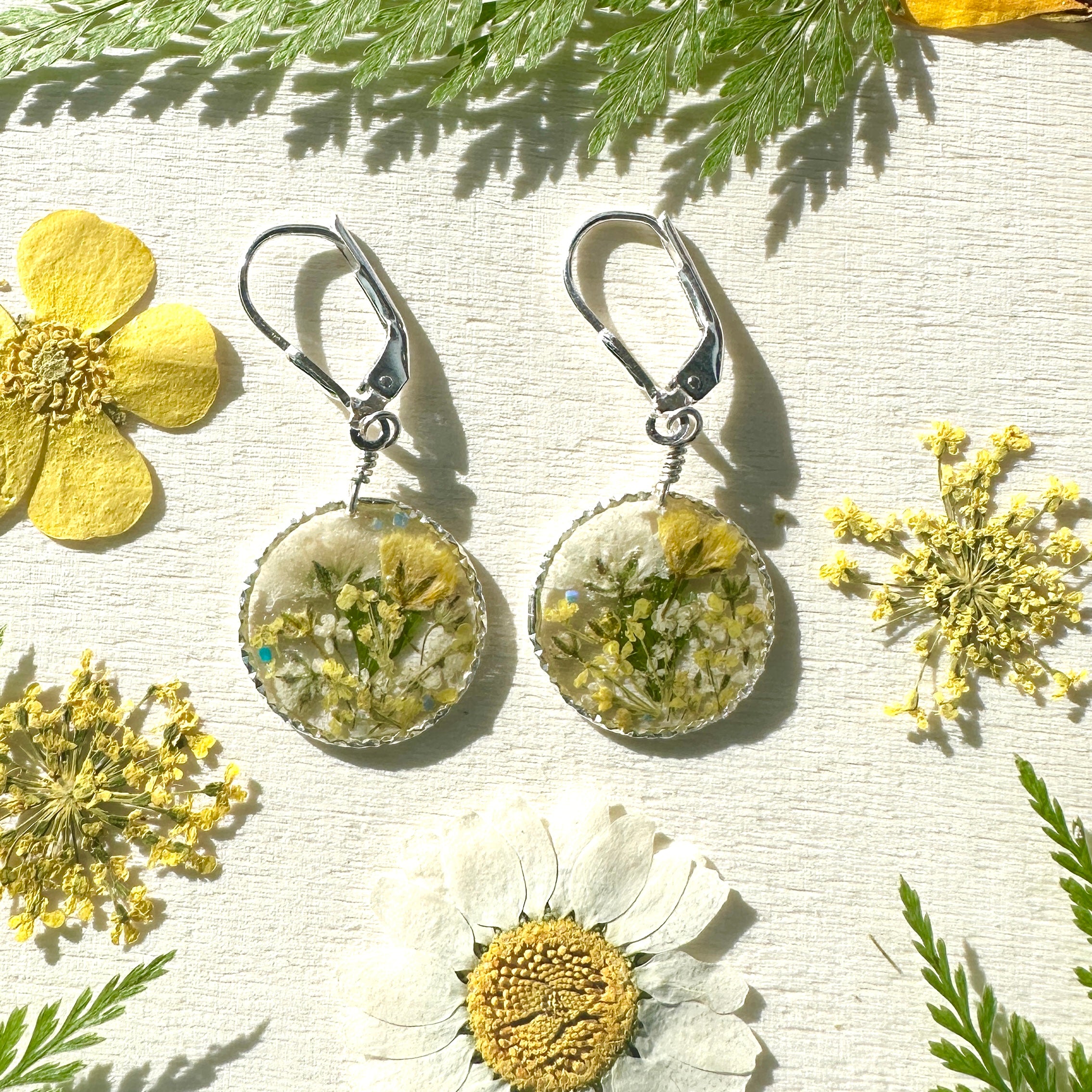 🌻Enjoy nature more with this cheerful, yellow botanical garden jewelry.  A lovely bouquet of yellow and white wildflowers are pressed, dried and preserved in resin. Each piece is sold separately.Â